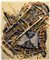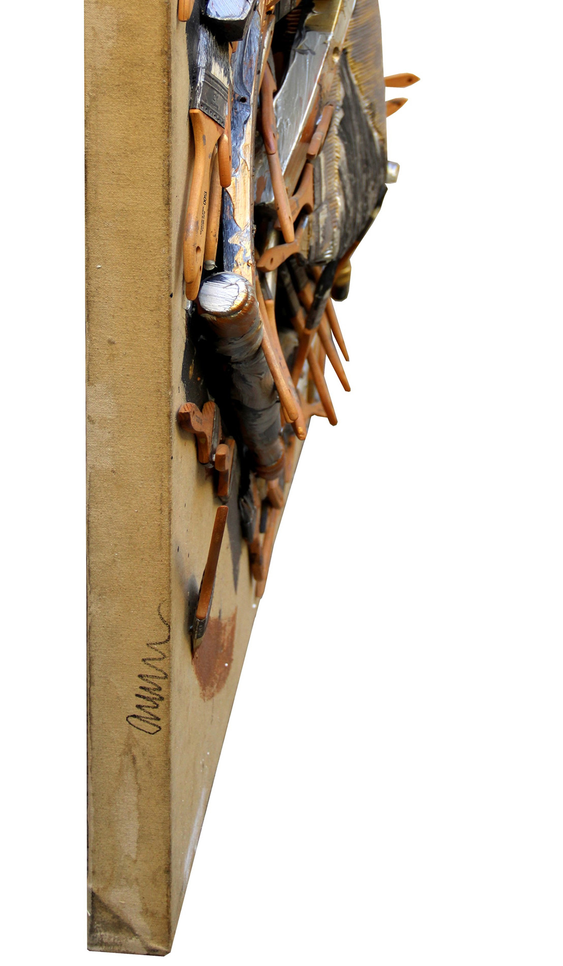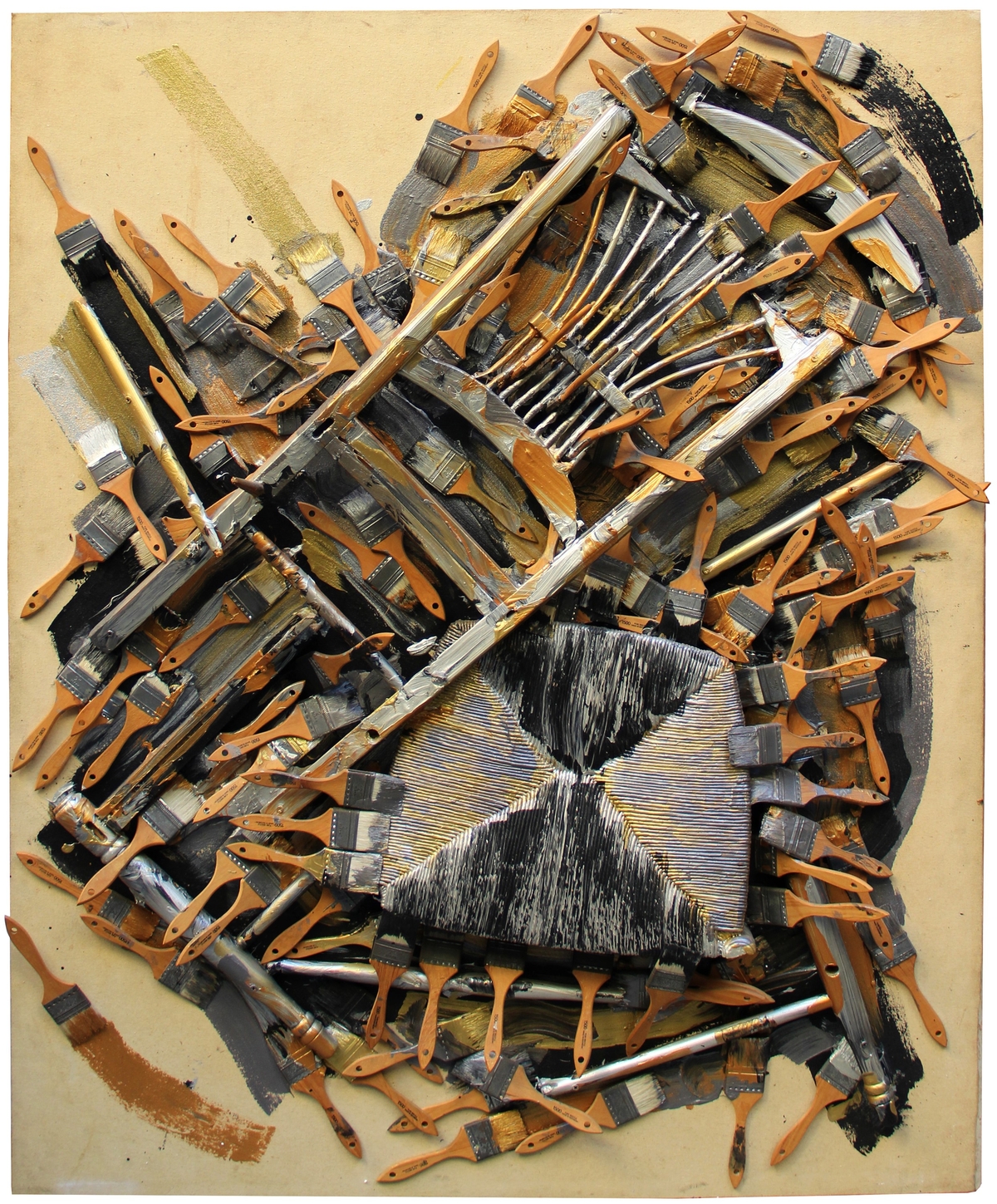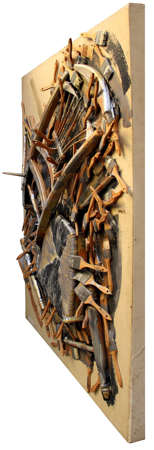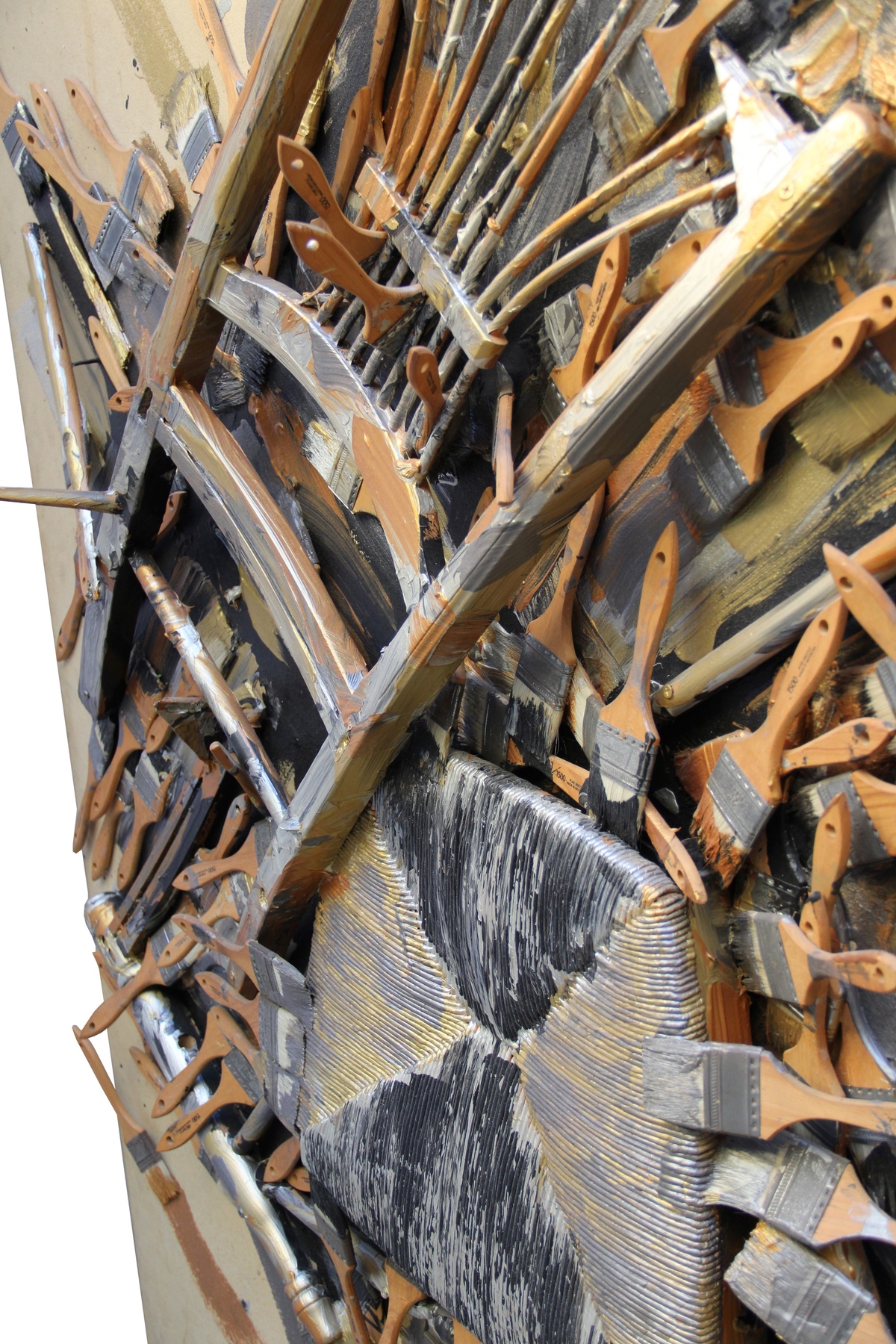 ARMAN Fernandez, Senza titolo, 1997, sedia spezzata, pennelli su tela con pittura acrilico nera, argento, oro e bronzo, cm 153x122