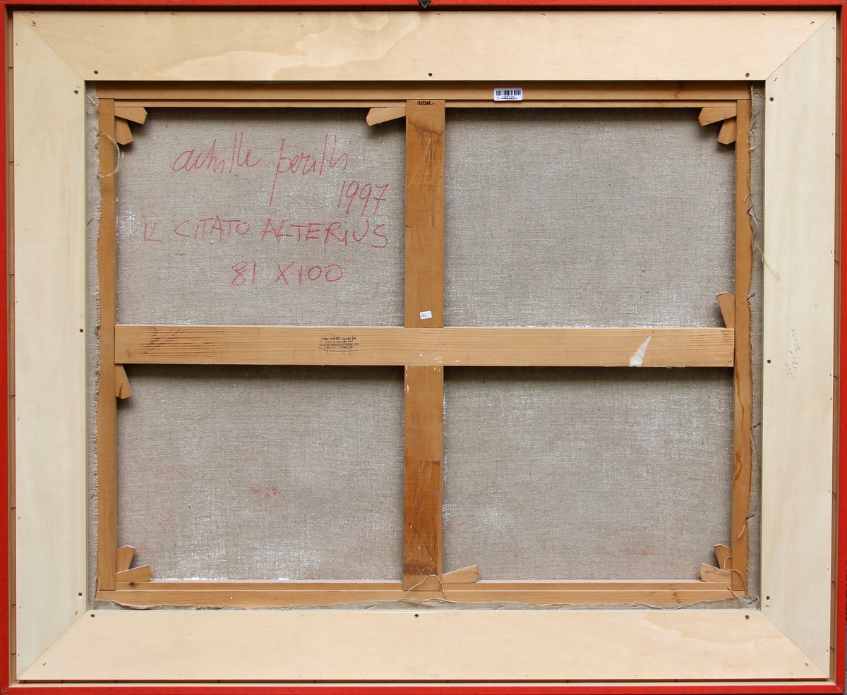 Firma, data, titolo, dimensioni "Achille Perilli, 1997, Il citato alterius, 81x100";