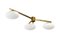Lampada a sospensione con struttura in ottone e diffusori in vetro satinato.