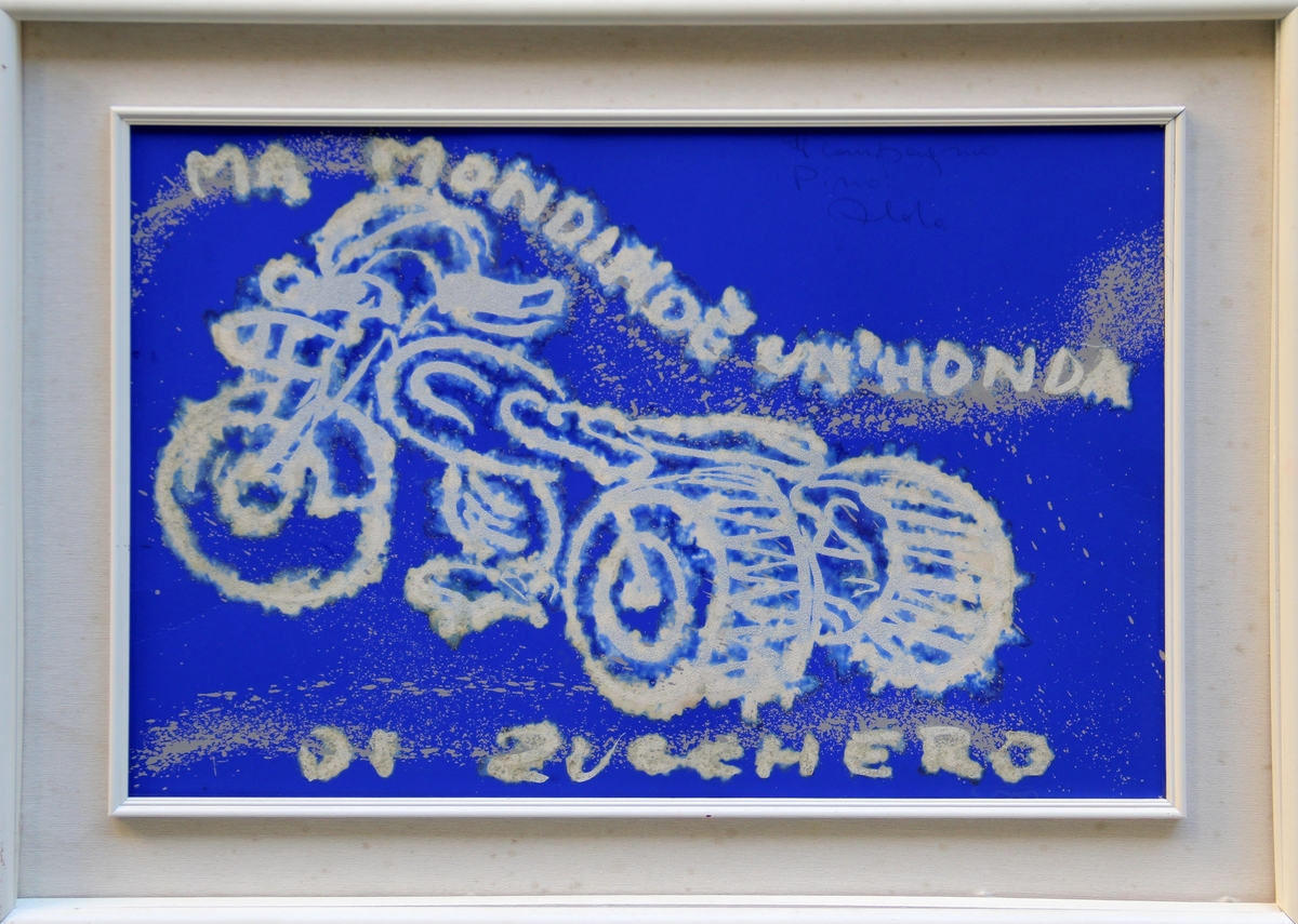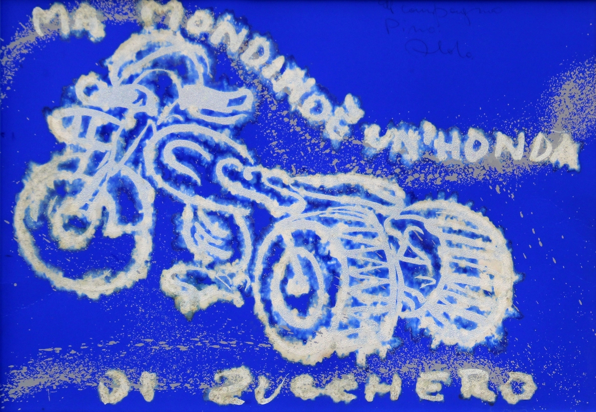 MONDINO Aldo, Ma Mondino è un'Honda di zucchero, 70's, tecnica mista e zucchero su cartone applicato su tela, cm 48x68