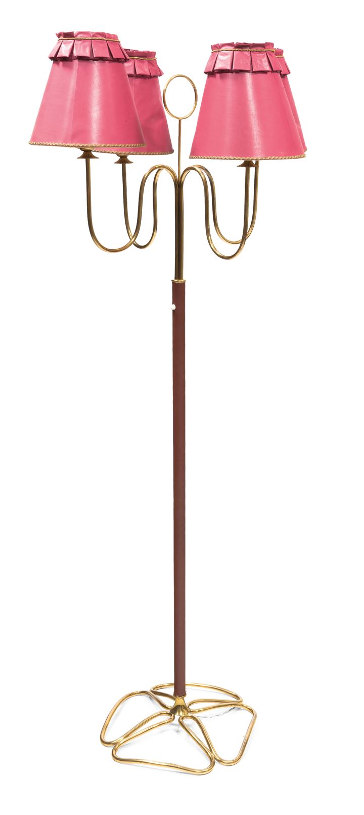 Lampada da terra con base in filo di ottone lucido a forma di quadrifoglio, stelo ricoperto in pelle e ottone. Diffusori in tessuto.