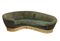 Grande divano curvo con struttura in legno, supporti in ottone e tessuto imbottito.