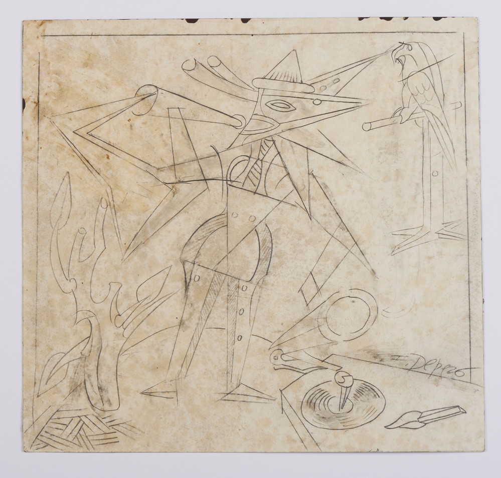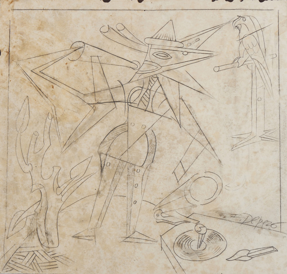 Realizzato durante il soggiorno newyorkese di Depero (1928-1930), questo disegno nasce per la rivista Atlantica (già Rivista d'Italia e d'America), testimone dell’energia creativa con cui l’artista rivoluzionò la grafica pubblicitaria e l’editoria. La scena, dominata da una figura meccanica che urla in un megafono, accanto a un fonografo e a un pappagallo, richiama i suoi iconici collages pubblicitari degli anni Venti e le figure delle sue sperimentazioni teatrali futuriste. Un esempio significativo del suo stile dinamico e visionario, in cui arte e comunicazione visiva si fondono in un'estetica modernista.