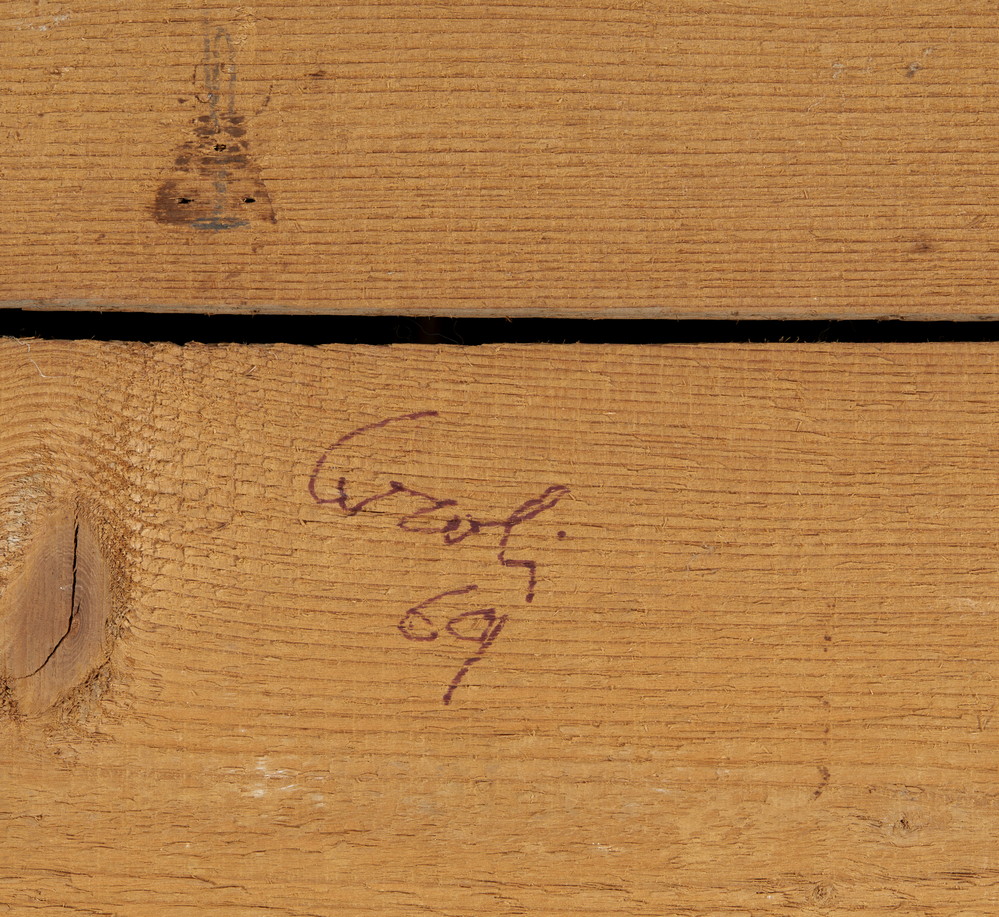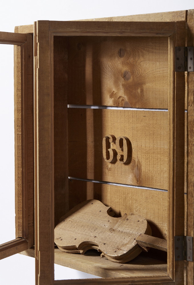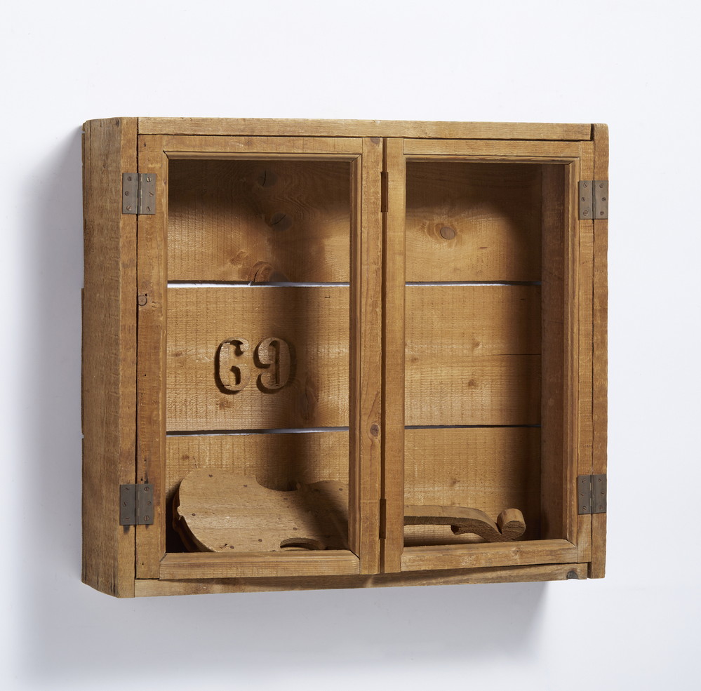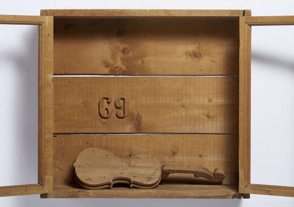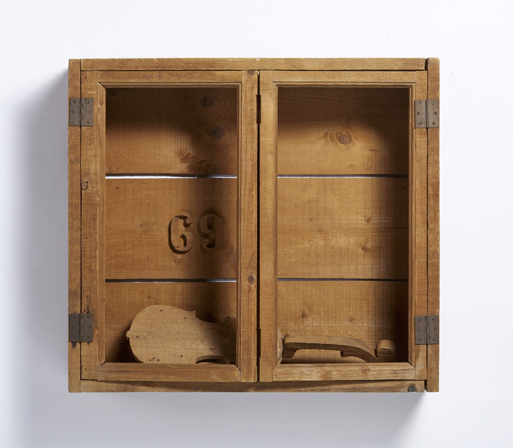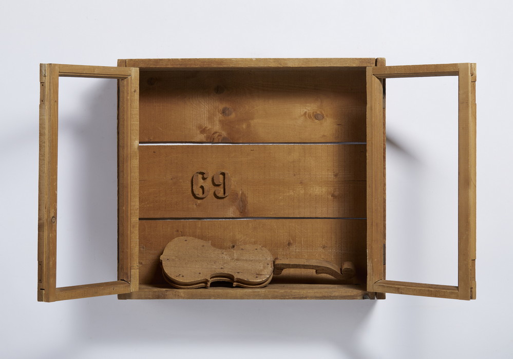 CEROLI MARIO (n. 1938) STIPO CON VIOLINO. 1969. Assemblaggio legno pino di Russia. Cm 78,00 x 70,00 x 20,00. sul retro: firma e data