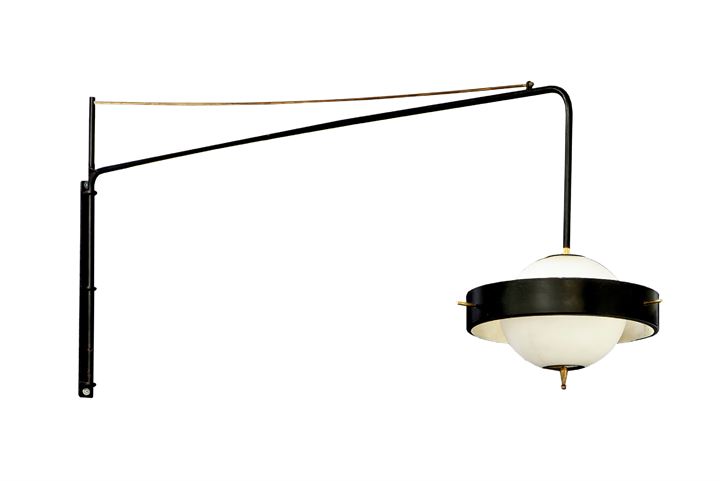 Lampada da parete smontabile con struttura in metallo laccato e ottone, diffusore sferico in vetro satinato.