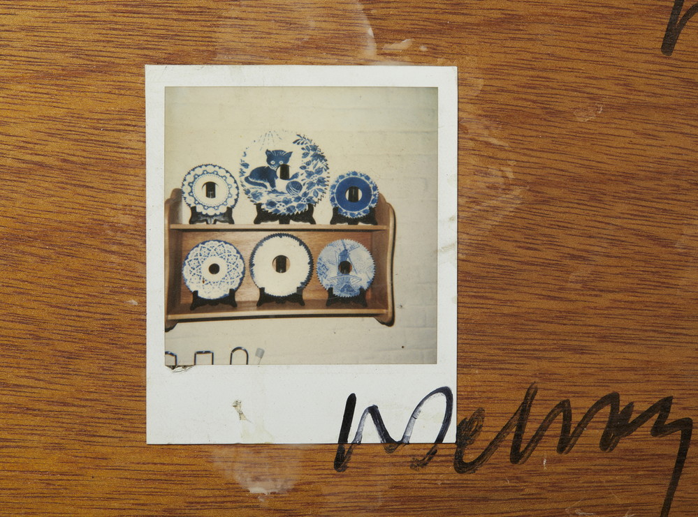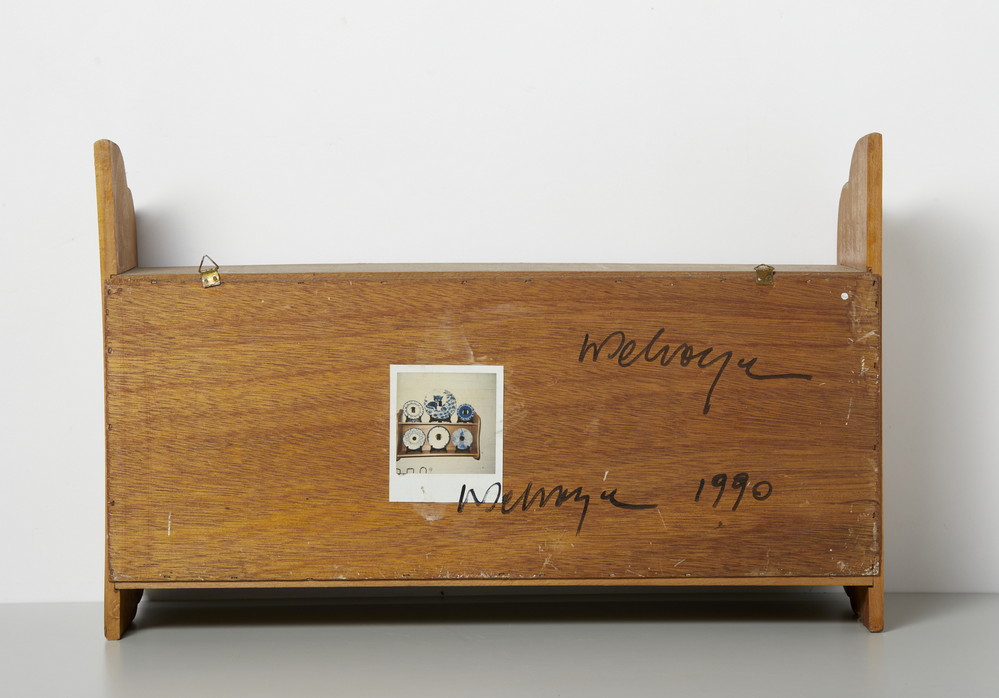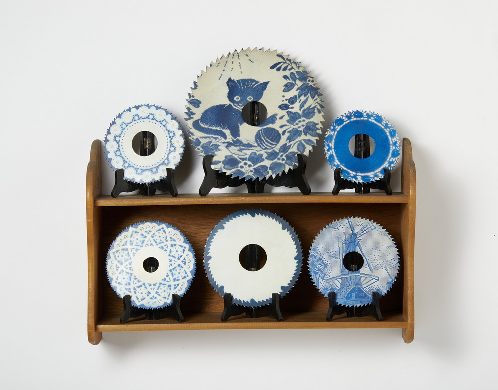 DELVOYE WIM (n. 1965) INSTALLATION OF 6 SAWBLADES.1990. smalto su metallo e mensola in legno. Cm 39,50 x 61,00 x 18,00. sul retro della mensola: doppia firma, data e fotografia dell'opera.