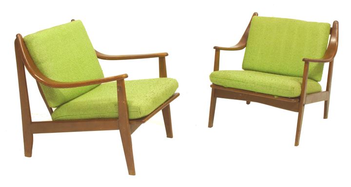 Coppia di poltrone con struttura in legno di teak ed imbottitura rivestita in tessuto.