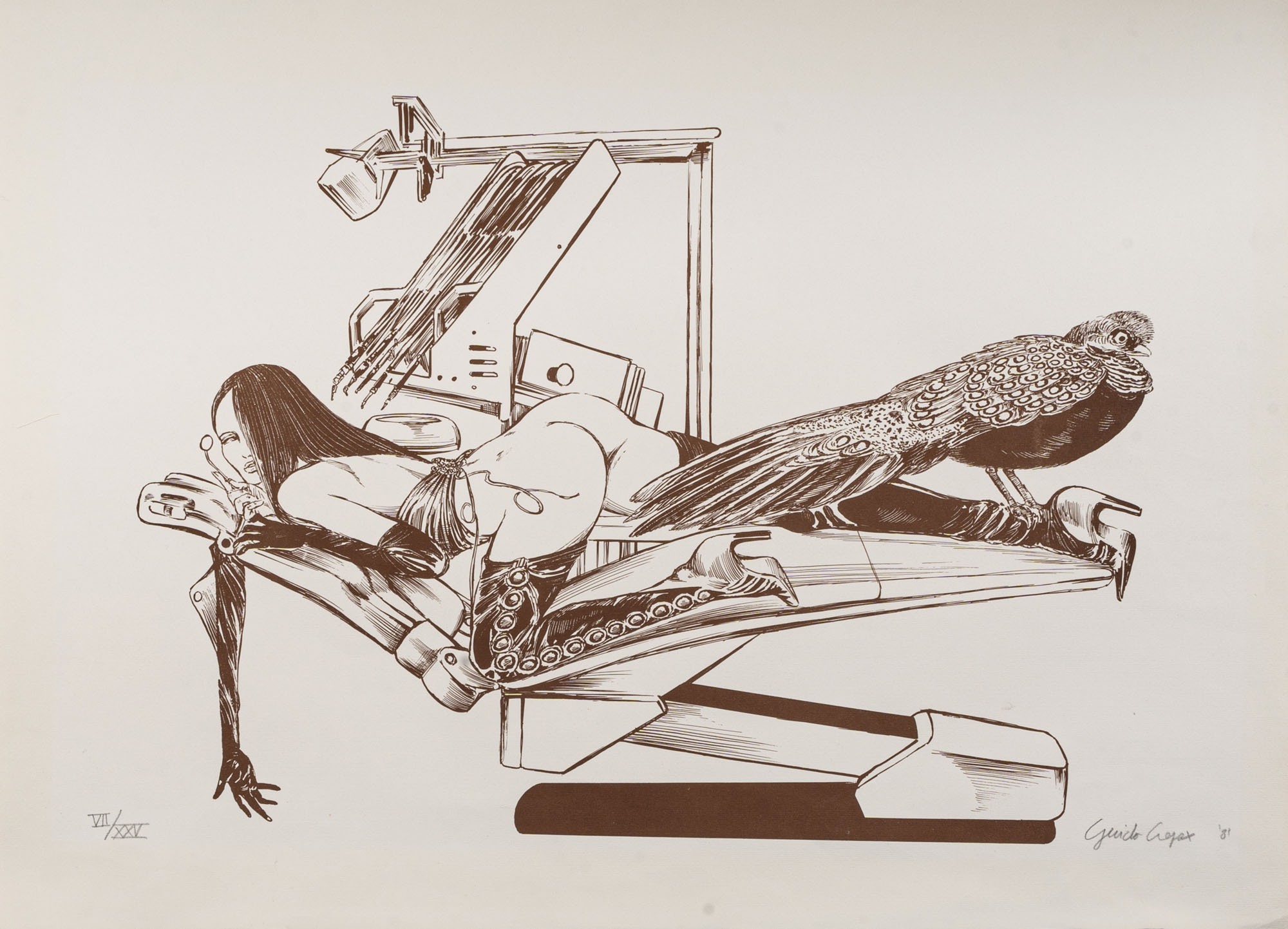 GUIDO CREPAX(1933 - 2003)Senza titolo1981Stampa litografica, es. VII/XXV, n. 3, parte del portfolio Indiscrezioni composto da 9 soggetti tirato a 150 copie numerate e firmate dall'autore. Realizzato in occasione del mese della prevenzione dentale del 198150 x 70 cmFirmata a matita e datata in basso a destra e numerata in basso a sinistra