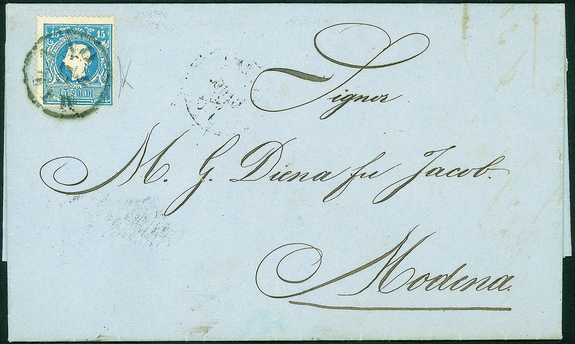 Antichi Stati Italiani - Lombardo Veneto - Governo Provvisorio - 15 soldi (B4)Ritagliato con le forbici in basso - lettera da Milano a Modena del 27 giugno 1859 - cert. Bottacchi