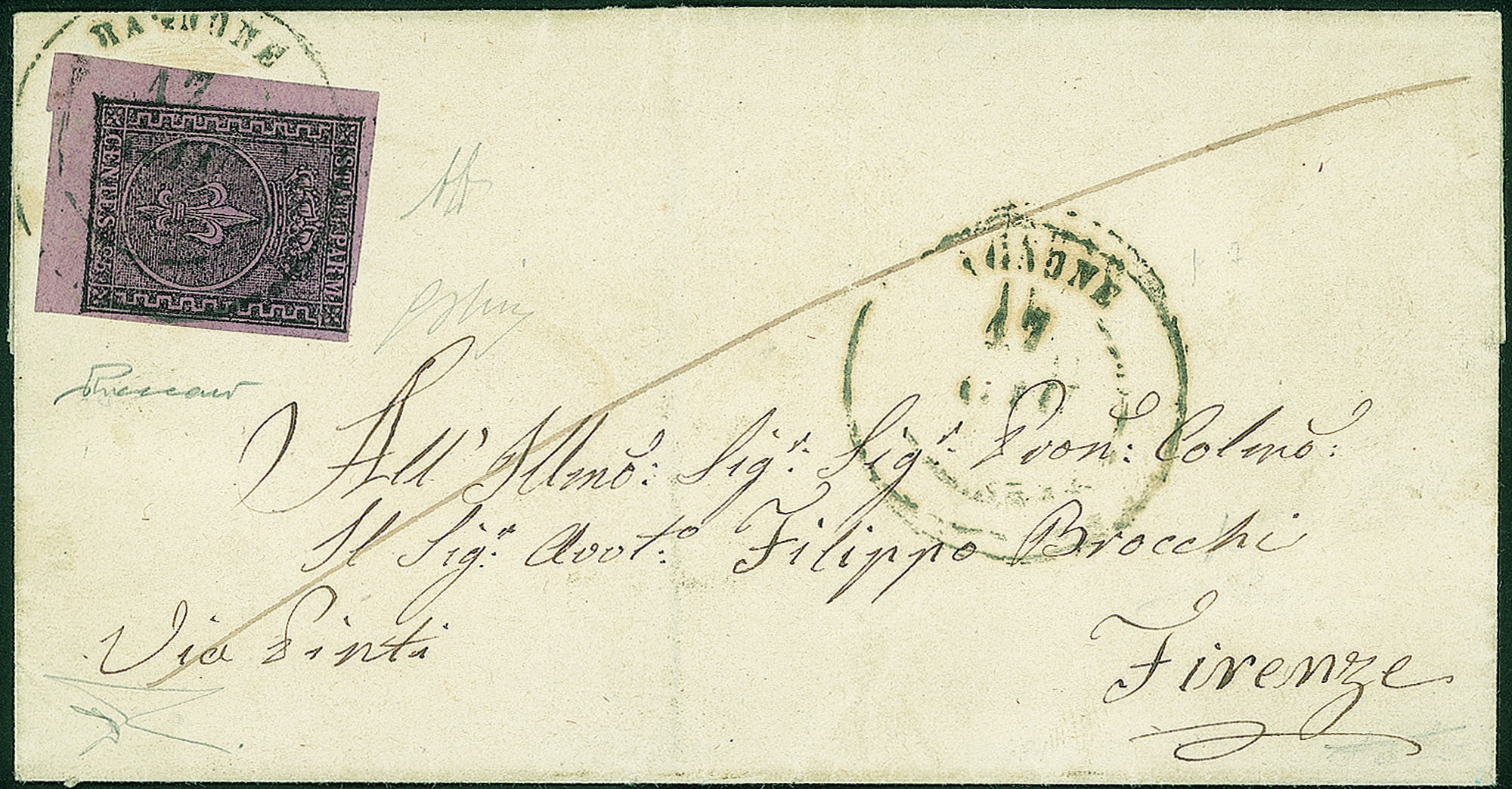 Antichi Stati Italiani - Parma - Lettera con 25 cent violetto (4)Angolo di foglio con annullo d.c. Bagnone 17 giu. 185... per Firenze (P.ti 11) - cert. Bottacchi e Vaccari