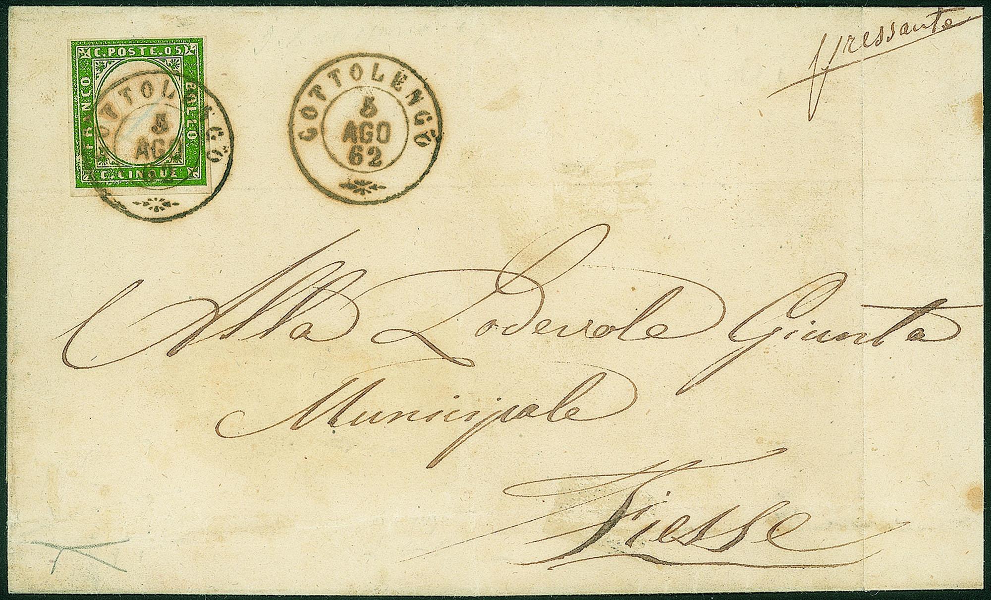 Antichi Stati Italiani - Sardegna - Lettera affrancata con 5 cent verde olivastro (13Dc)Isolato da Gottolengo 5 ago. 62 per Fiesse - cert. Bottacchi