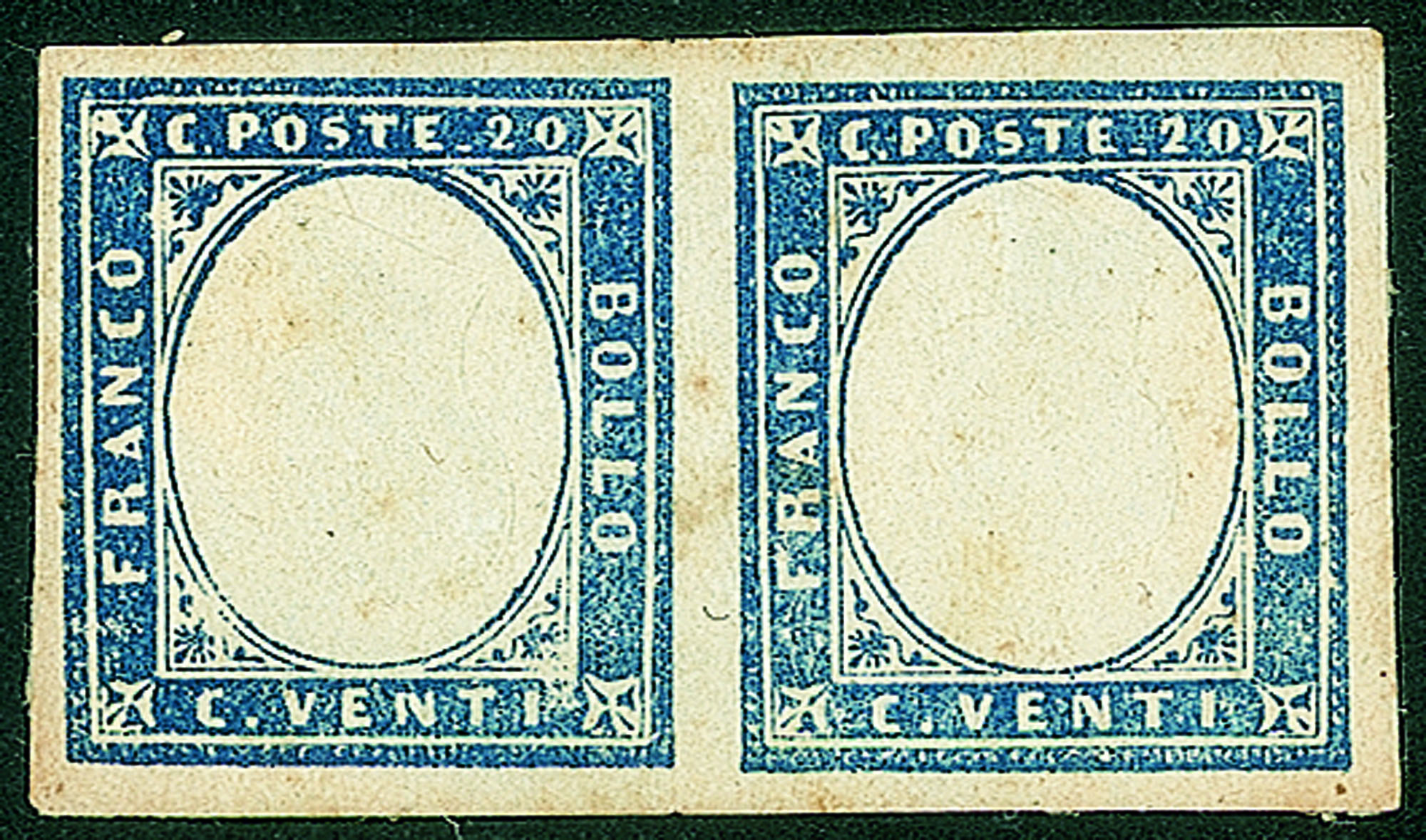Antichi Stati Italiani - Sardegna - 1860 - 20 cent azzurro (15Cc)Effigi capovolte - coppia orizzontale - gran parte di gomma originale