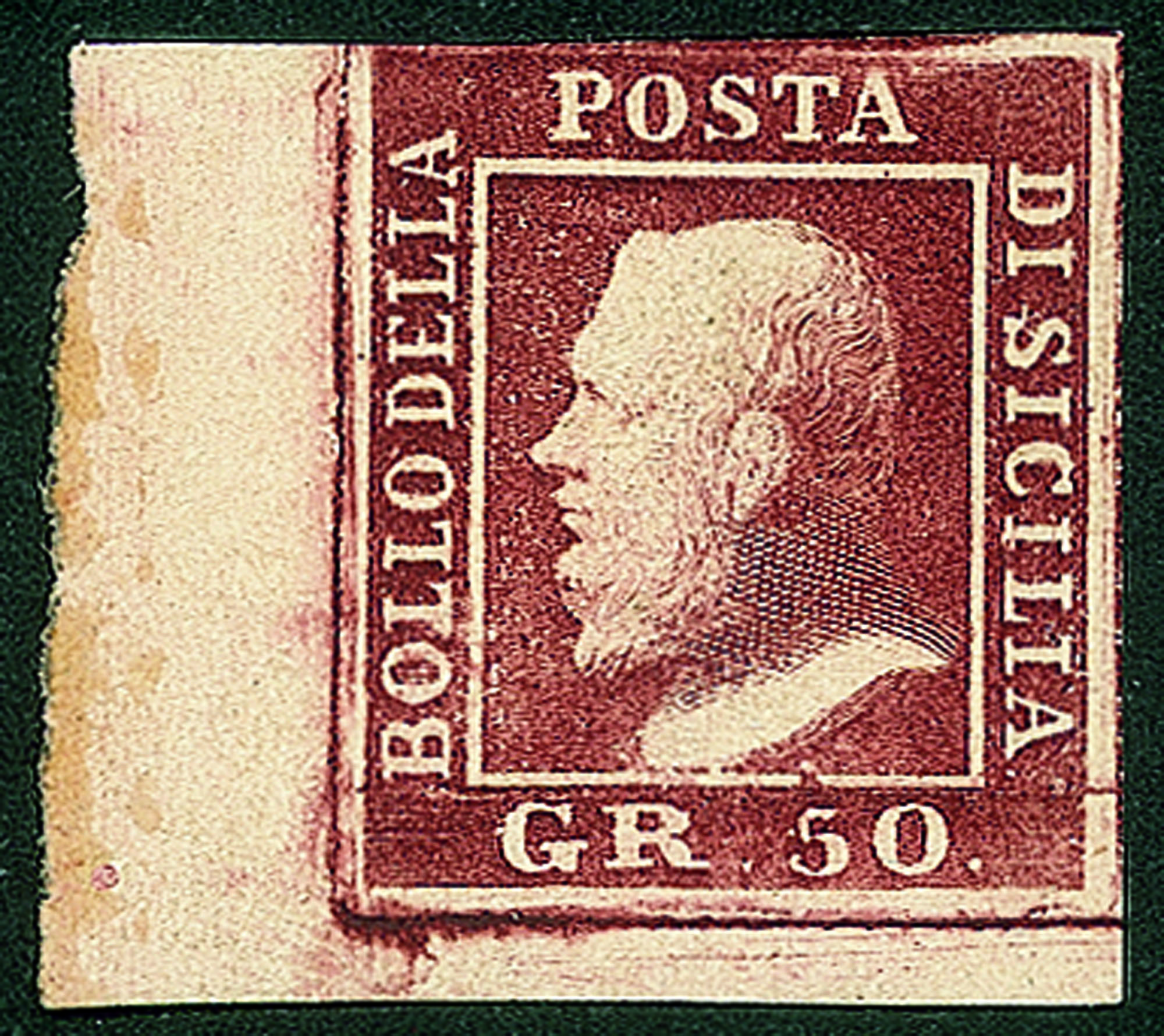 Antichi Stati Italiani - Sicilia - 1859 - 50 grana cioccolato (14a)Angolo di foglio (Posiz. 91) - gomma originale - A. Diena + G.Bolaffi + M. Raybaudi + Sorani