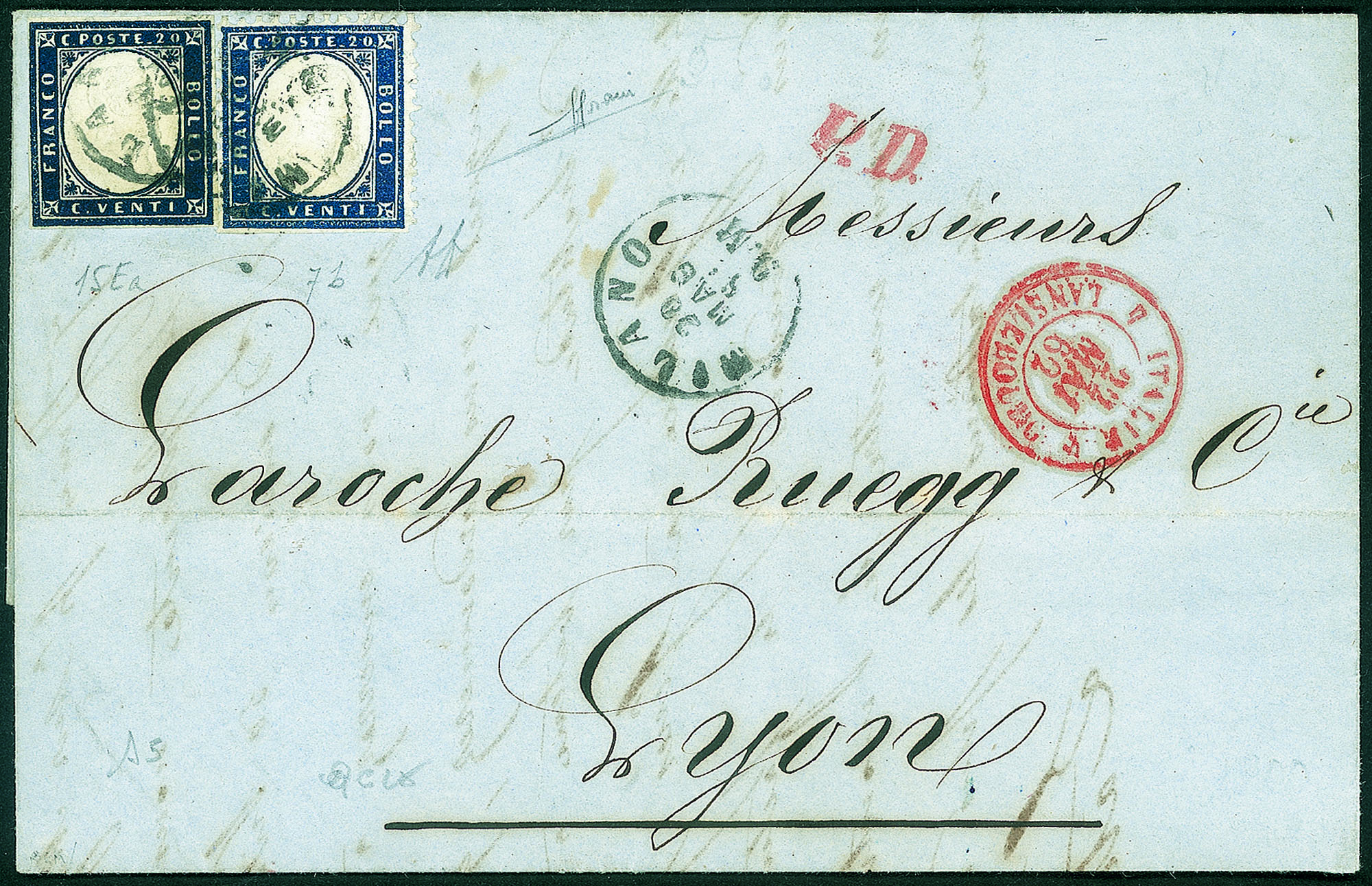 Regno - Vittorio Emanuele II - Affrancatura mista con valori gemelliDentellato di Regno e non dentellato di Sardegna da Milano 28 mag. 62 per Lione - cert. A. Diena