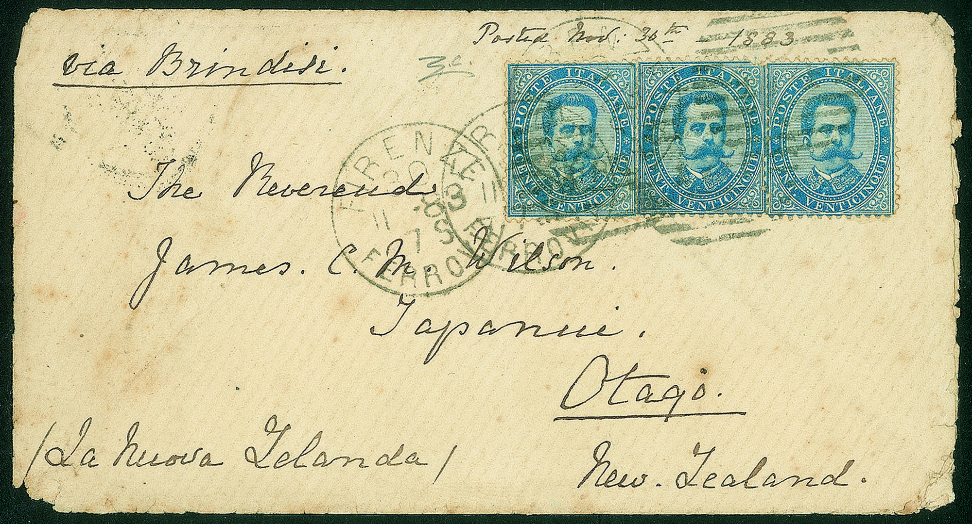 Regno - Umberto I - Bustina affrancata con tre esemplari del 25 cent azzurro Floreale (40)Uno difettoso - da Firenze 30.11.83 per Otago in Nuova Zelanda - destinazione non comune - cert. G. Colla