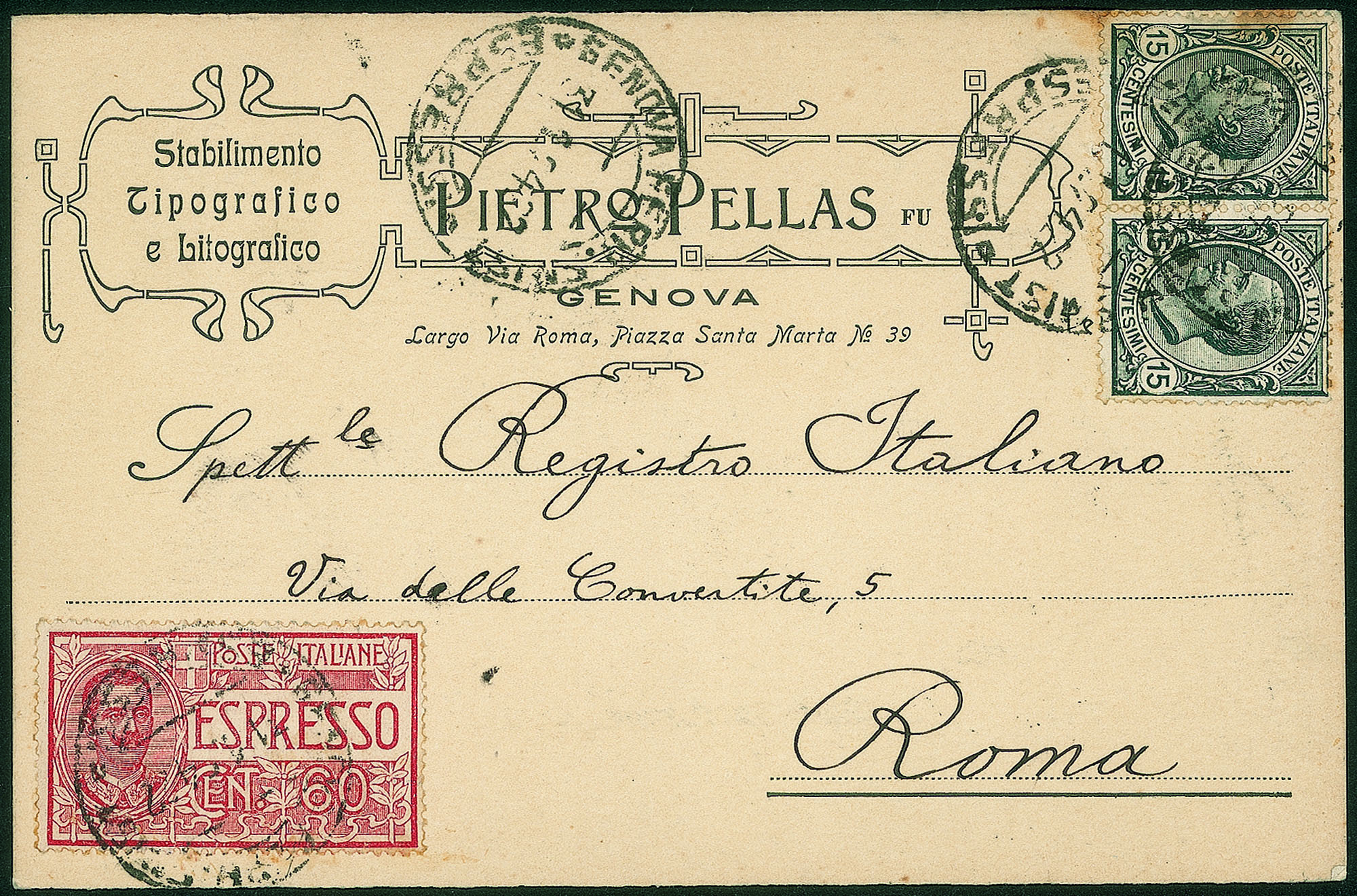 Regno - Vittorio Emanuele III - Cartolina intestata Pietro Pellas Stabilimento TipograficoAffrancata con coppia 15 cent grigio Leoni + 60 cent rosso Espresso (108 + E7) da Genova 31.1.24 a Roma