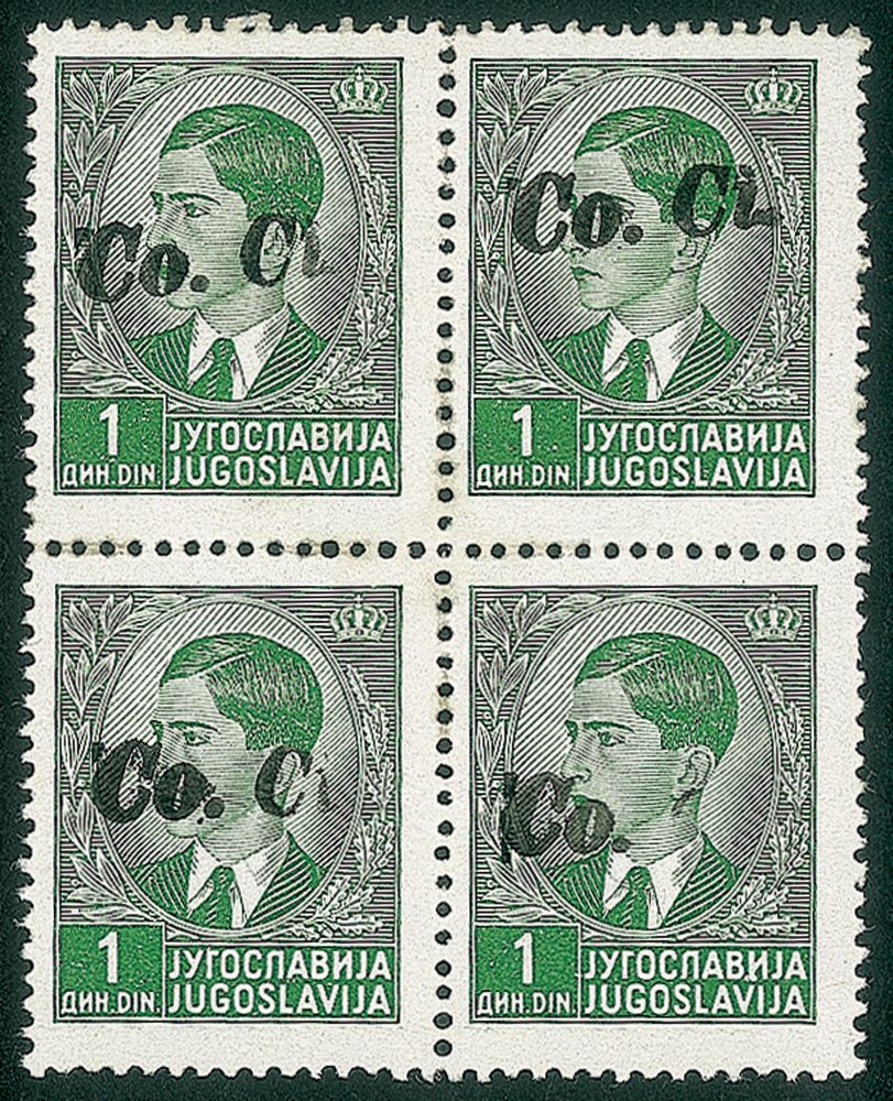 Occupazioni II guerra mondiale - Lubiana - 1941 - 1 din (3Bb + 3Bb + 3B + 3B varietà ga)Quartina con soprastampa obliqua (in alto) - senza Ci in basso a destra - gomma originale - non catalogato