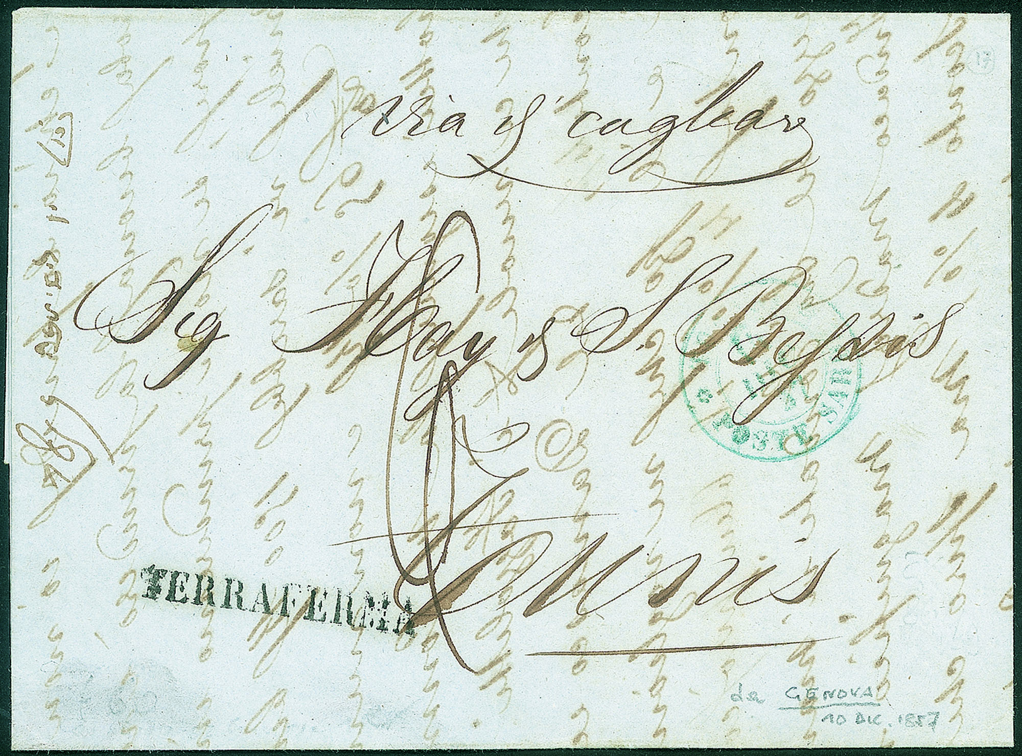 Uffici Postali all'Estero - Levante - Lettera non affrancata da Genova 10 dic. 1857Con bollo lineare Terraferma e con bollo d.c. azzurro Tunisi Poste Sarde Apposto in Arrivo con Tassa 6 Decimi