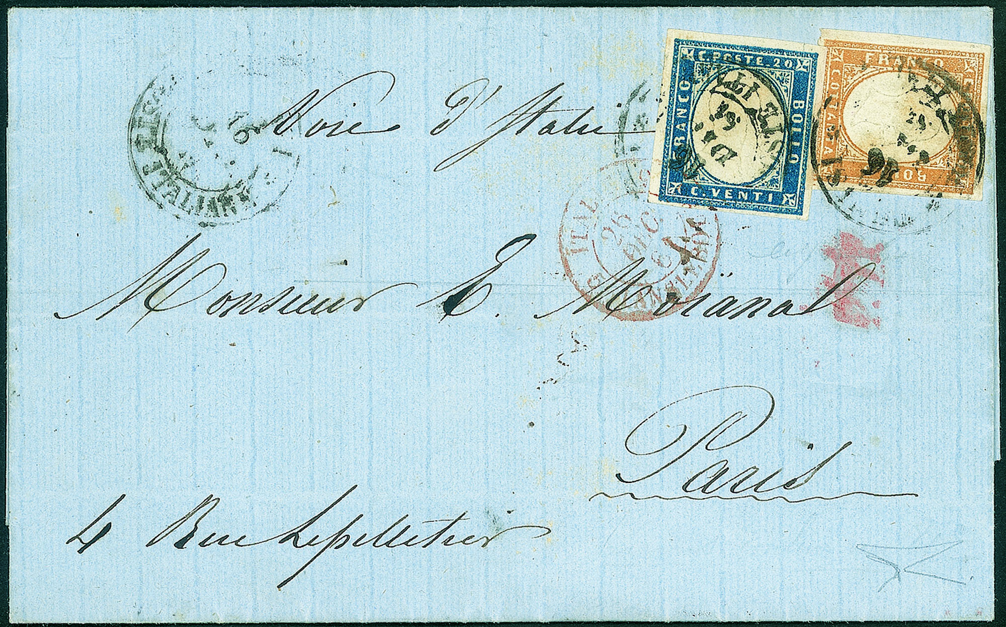 Uffici Postali all'Estero - Levante - Lettera con quarta emissione 20 cent azzurro + 80 cent bistro (15Dc + 17)Da Tunisi Poste Italiane per Parigi - cert. Bottacchi