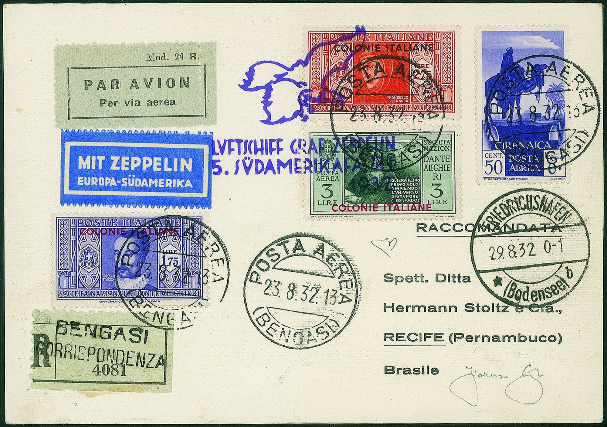 Colonie - Emissioni generali - 1932 - Graf Zeppelin 5° SudamerikafahrtCartolina raccomandata per Recife affrancata recto verso con Colonie Emissioni Generali otto valori dell'emissione Pro Società Dante Alighieri + Cirenaica 50 cent Posta Aerea annullati Posta Aerea (Bengasi) 28.8.32