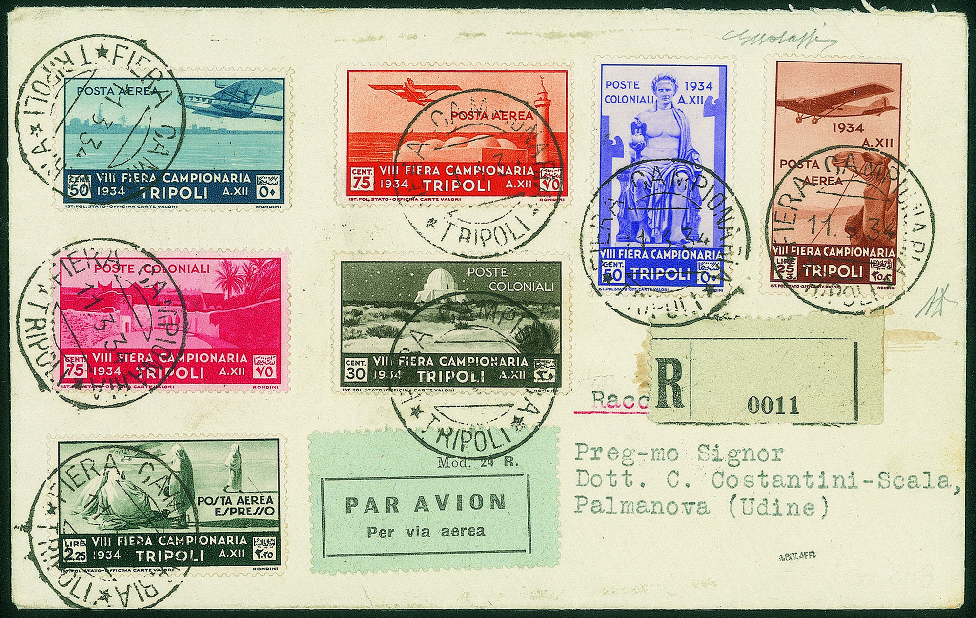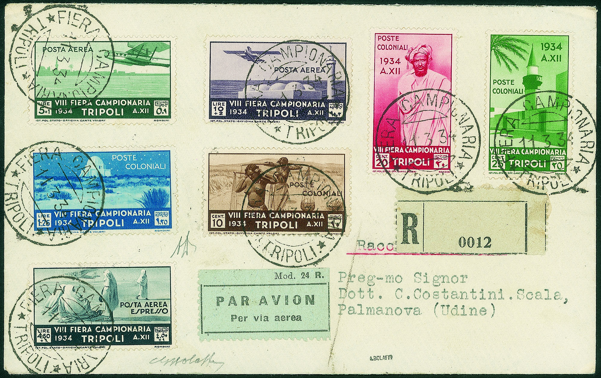 Colonie - Libia - 1934 - VIII Fiera Campionaria di Tripoli serie completa + Aerea (Libia 125/131 + A14/20)Su due aerogrammi raccomandati espresso per Palmanova - cert. G. Bolaffi