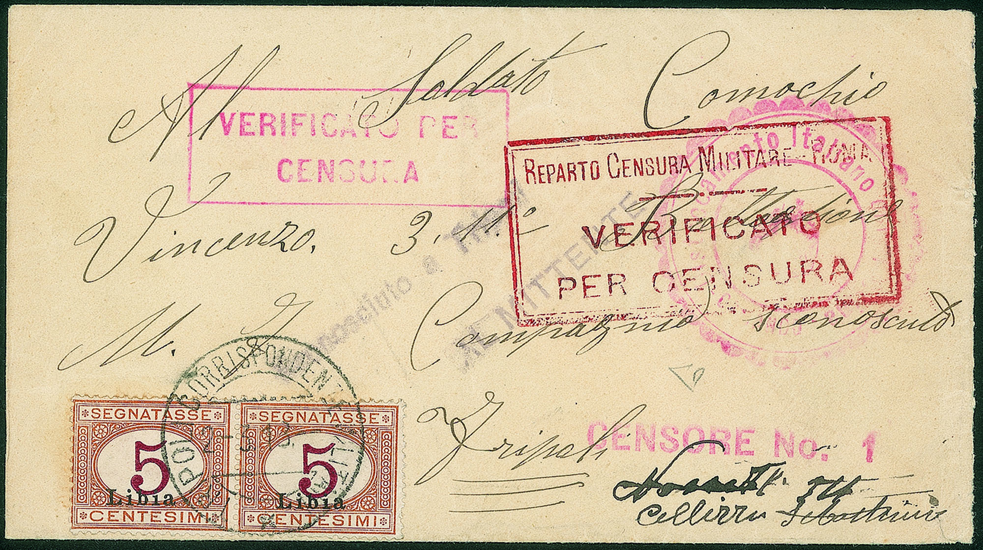 Colonie - Libia - Tripoli Corrispondenze Militari - 5 cent (1A - cifra rosso bruno)Coppia orizzontale - Comando Distaccamento Italiano di Palestina - busta tassata in arrivo - 2.3.1918 - En. Diena