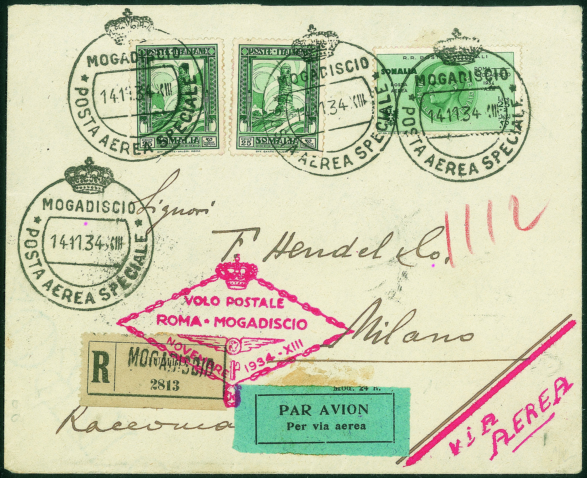 Colonie - Somalia - 1934 - Volo di Ritorno Mogadiscio RomaAerogramma affrancato con Somalia Aerea lire 25 (+2) verde + Pittorica due esemplari cent 25 verde (172 + A16) con annulli speciali