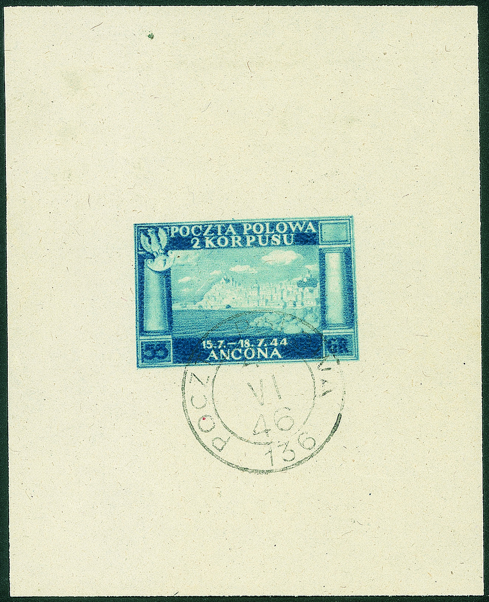Corpo Polacco - 1946 - Foglietto 55 g. Vittorie Polacche in Italia su carta grigia leggera annullato Poczta Polowa 4.IV.46 (BF2A)