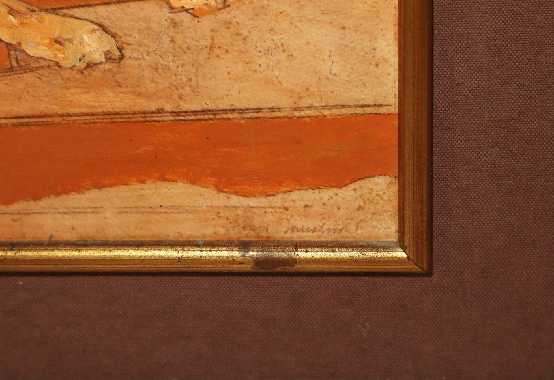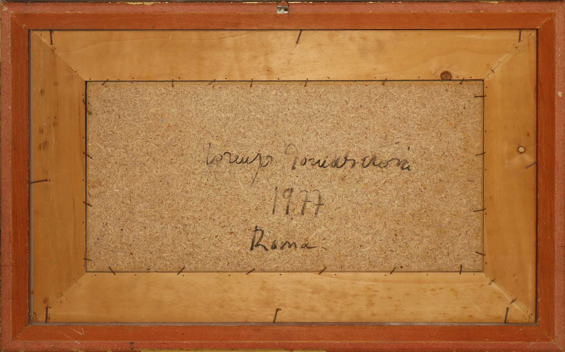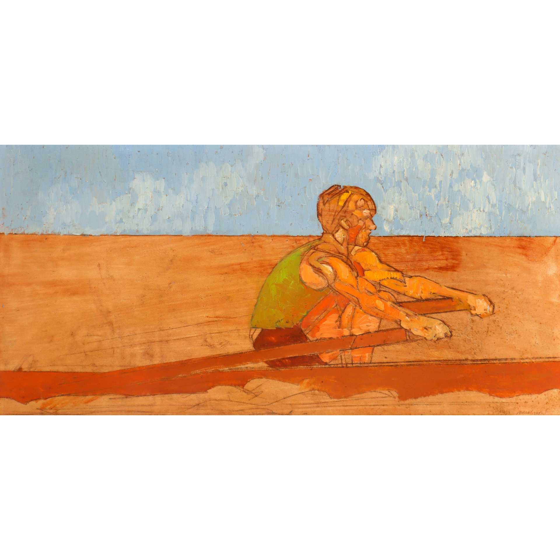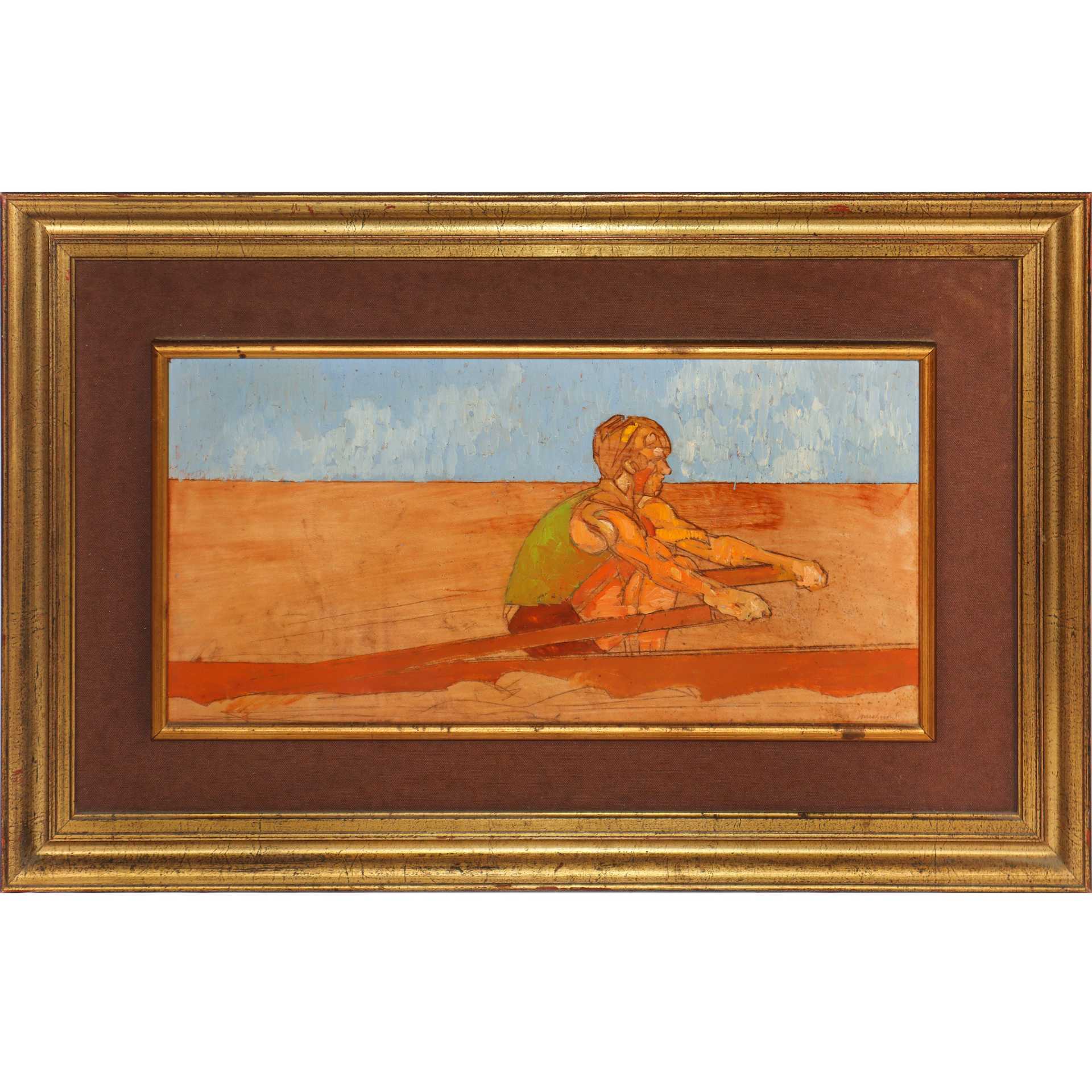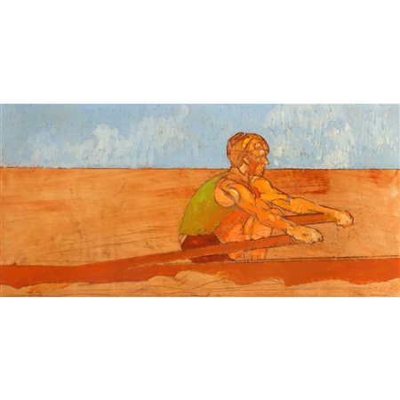 Lorenzo Tornabuoni (Roma 1934 - Roma 2004) - Uomo con la canoa h cm 25X50 in cornice h cm 46X71 olio su legno Firmato datato sul retro. Firmato in basso a destra