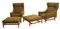 Coppia di poltrone con pouff, struttura in legno e imbottitura rivestita in tessuto.