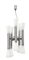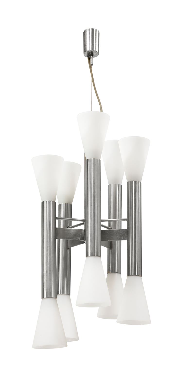 Lampada a sospensione in acciaio satinato e diffusori in vetro satinato.