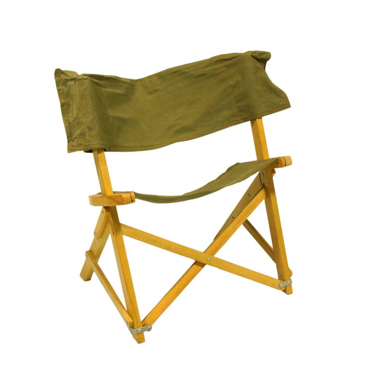 Seggiolina pieghevole con struttura in legno e seduta in tessuto.