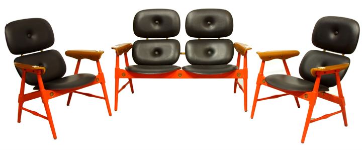 Divano e due poltroncine in legno laccato, seduta in compensato curvato rivestito in skai.