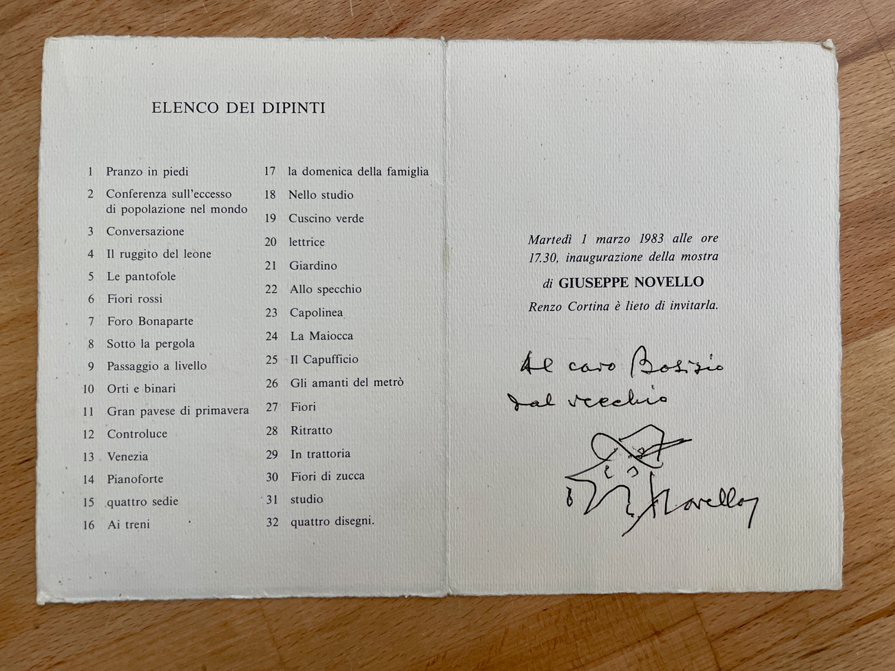 Si allega un invito con un'ulteriore dedica e firma al retro