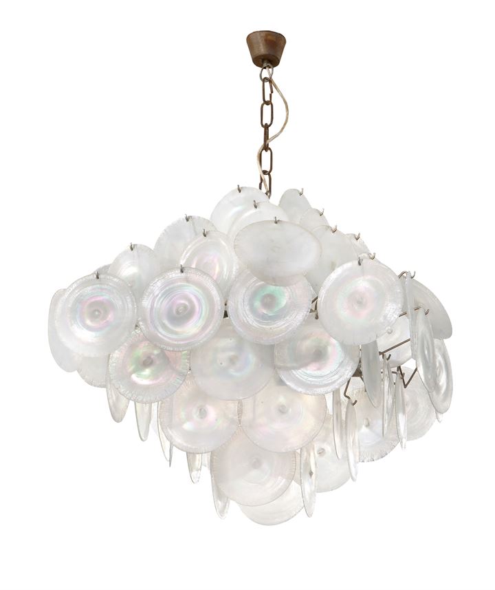 Lampada a sospensione con struttura in metallo nichelato, dischi in vetro madreperlato e opalescente.