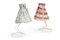 Coppia di lampade da tavolo con struttura in metallo laccato e paralumi in stoffa.