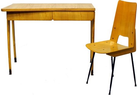 Scrivania con sedia in legno di noce chiaro e metallo laccato