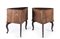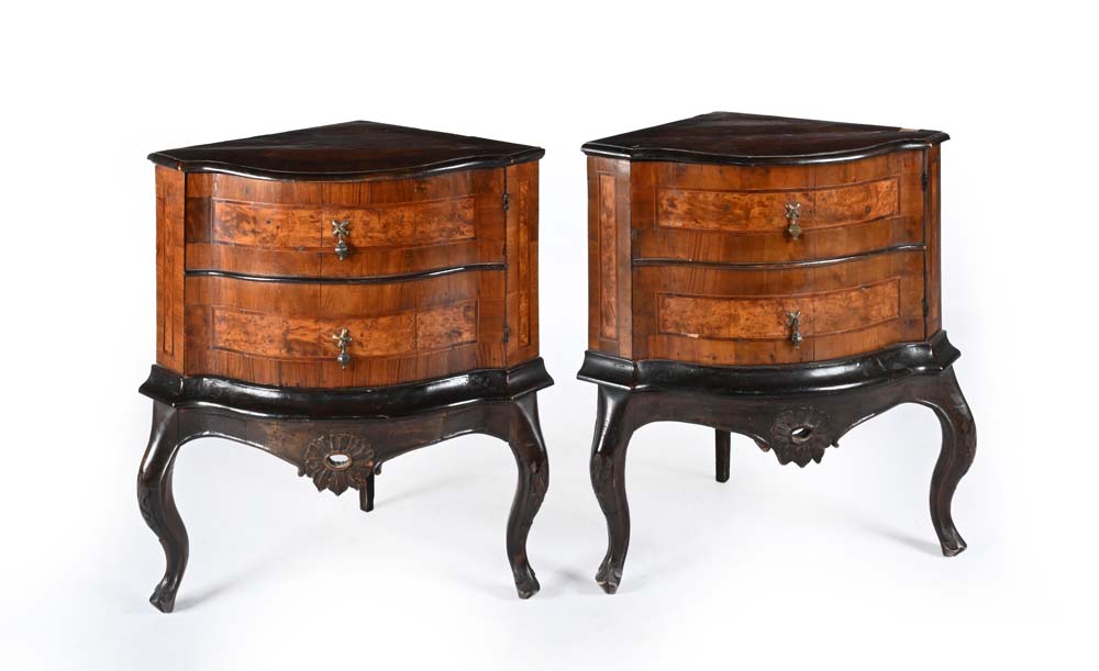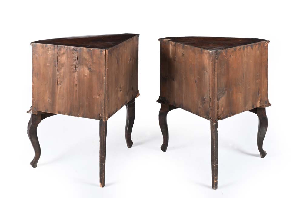 Coppia di angoliere in noce e radica di impostazione settecentesca costruite con elementi antichi, recano facciata di linea convessa delimitata da paraste angolari, con anta suddivisa a simulare due cassetti; grembiale sagomato, gambe mosse cm x77x52