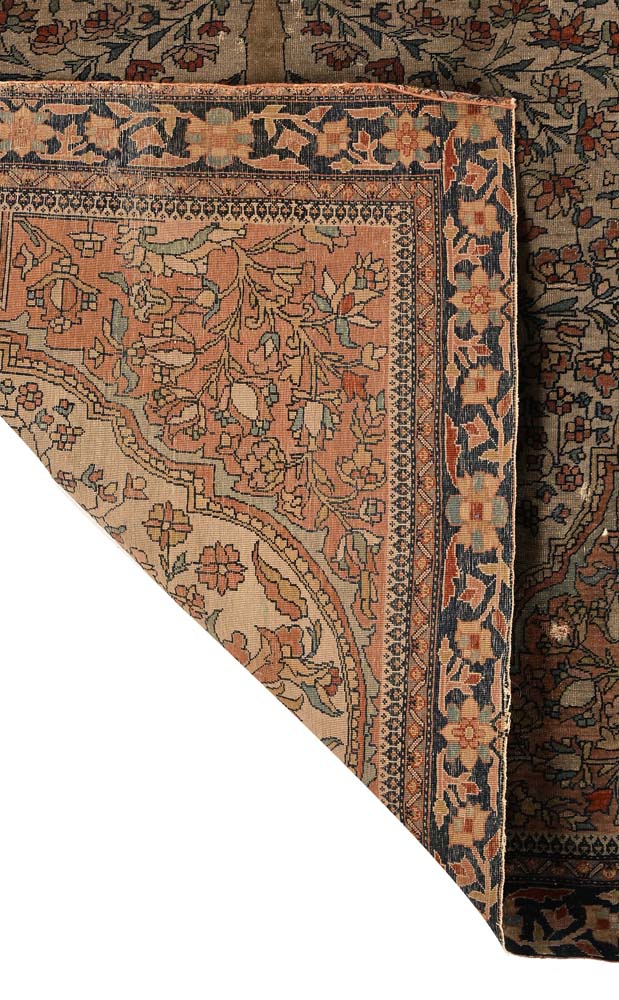 Tappeto Persiano Kashan “Albero della Vita” fine XIX/inizi XX secolo Il campo principale, in tonalità beige e avorio, è riccamente decorato con dettagli floreali e rami stilizzati, impreziositi da colori come rosso mattone, verde e blu scuro. La bordatura, con fondo blu intenso, incornicia elegantemente il tappeto con una serie di motivi floreali intrecciati, tipici dei tappeti Kashan di alta qualità.