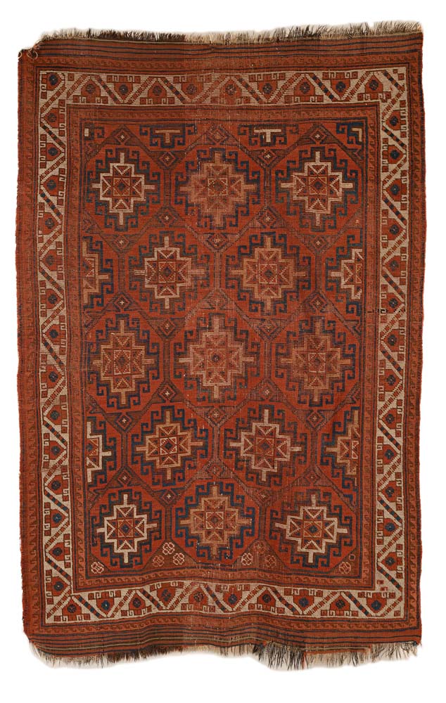 La bordura è decorata con motivi a losanga e dettagli tribali stilizzati su sfondo avorio, creando un interessante contrasto con il campo principale in rosso ruggine.; molto usurato cm 177x117