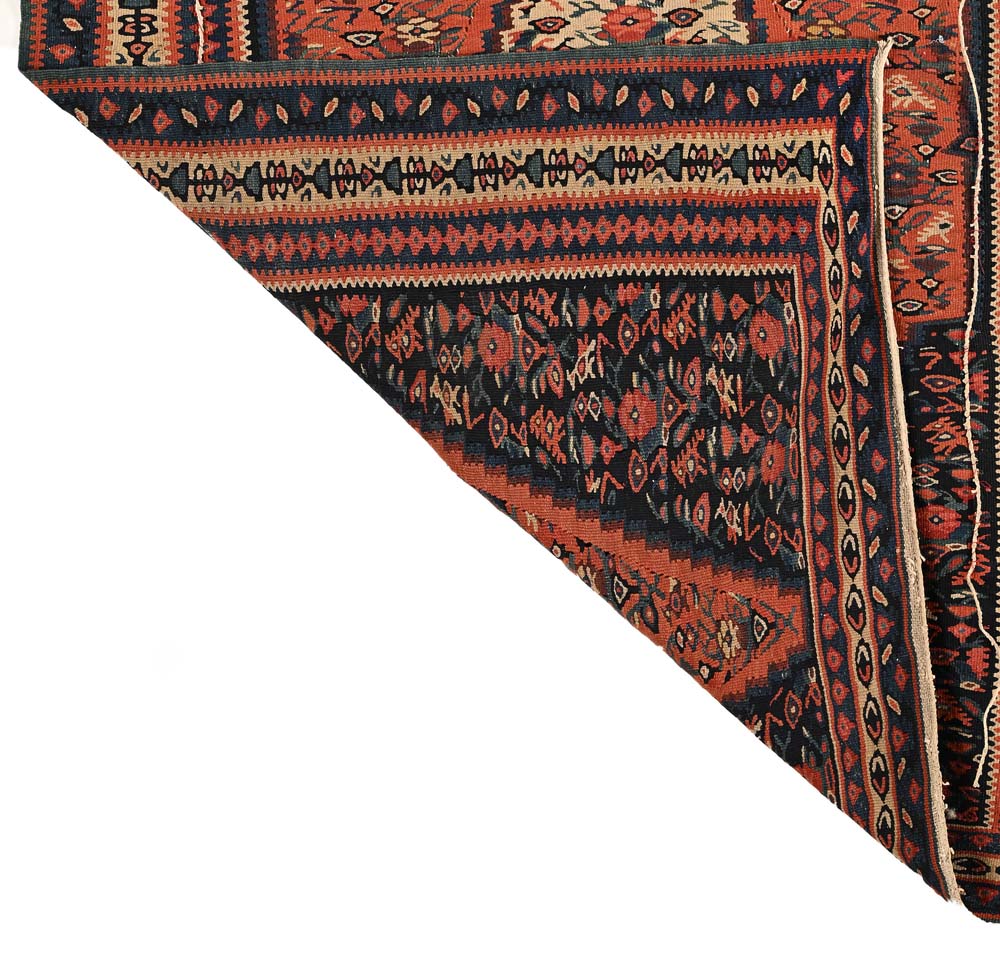 Tappeto Kilim Sharkoy fondo rosso, inizio XX secolo realizzato con la tecnica della tessitura piatta (senza pelo), tipica dei kilim, presenta un grande medaglione a losanga centrale, incorniciato da motivi geometrici e floreali stilizzati. Il campo principale è decorato con piccoli elementi ornamentali disposti in modo simmetrico, mentre la bordatura mostra una sequenza di motivi a zig-zag e decorazioni floreali astratte. cm 200x100