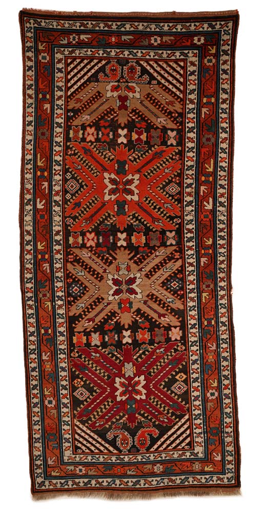 Passatoia Caucasica Kazak Questo tappeto è caratterizzato da tre grandi medaglioni geometrici a forma di stella, tipici dello stile Kazak, presenta un ricco campo decorato con motivi tribali e dettagli geometrici stilizzati.