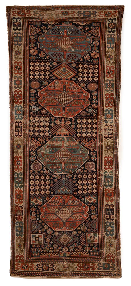 Piccola corsia caucasica Karabagh, fine XIX/inizio XX secolo Il campo principale presenta una complessa combinazione di elementi decorativi tradizionali, con motivi floreali stilizzati e rosette su un fondo nero, creando un forte contrasto cromatico con i toni del rosso mattone, verde e avorio.