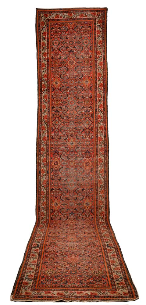 Corsia Melayer fondo rosso, Persia, inizi XX secolo disegno a tutto campo a losanghe delineate in nero entro molteplici piccole bordure; cornice principale bianca percorsa da corolle; zone usurate cm 506x105
