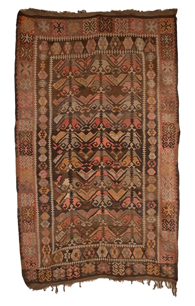 La bordura è arricchita da una successione di motivi floreali stilizzati e forme esagonali, tipiche dei kilim prodotti dalle tribù anatoliche. Difetti