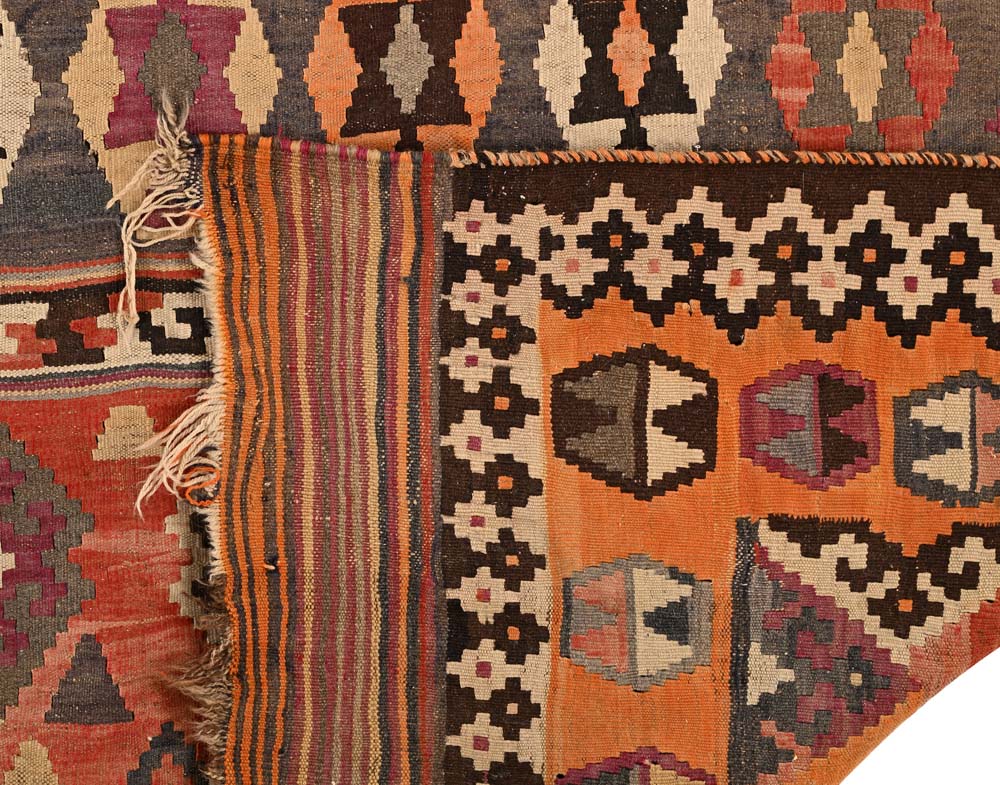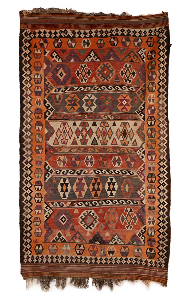 Tappeto Kilim Anatolico, Turchia, XX secolo Il campo principale è suddiviso in bande orizzontali contenenti disegni a losanga e simboli tradizionali, utilizzati per esprimere benedizioni, protezione e fertilità.