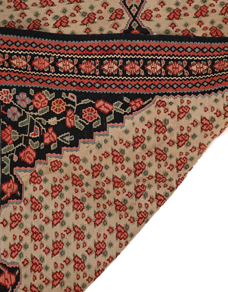 Tappeto Kilim Bessarabia, inizio XX secolo Il campo centrale, su sfondo avorio, è decorato con un raffinato motivo floreale a piccoli boccioli rossi e verdi, creando un effetto di grande armonia visiva. Al centro, un medaglione nero con una composizione di fiori stilizzati arricchisce il design, tipico dei tappeti di questa regione. cm 170x110