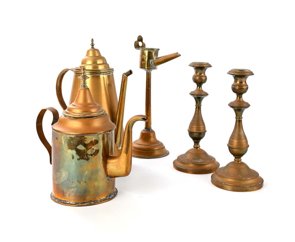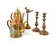 Cinque oggetti in metallo dorato, arte europea e medio orientale caffettiera di forma troncoconica con versatoio cilindrico e coperchio a cupolino (altezza cm 30); caffettiera cilindrica con versatoio e manico sagomati (altezza cm 24); lucerna con alto stelo cilindrico su piede circolare (altezza cm 30); coppia di candelieri (altezza cm 23,5) misure diverse