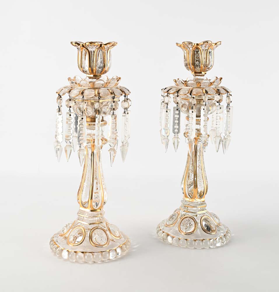 Coppia di girandoles in vetro con decorazioni dipinte in oro, Irlanda, XIX...