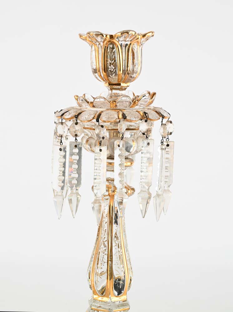 Coppia di girandoles in vetro con decorazioni dipinte in oro, Irlanda, XIX secolo unico portacandela centrale arricchito da pendenti poliedrici disposti lungo la circonferenza altezza cm 37